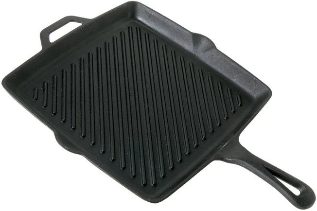 The Camp Chef 11″ Square Skillet With Ribs grill pan is made from cast iron and perfect when grilling a nice piece of meat or crunchy vegetables. The ridges ensure that the fat is drained and leave perfect grill stripes on your dish. You can use the pan on the stove but also in the oven or over an open flame it will prove its worth. The pan is enhanced with a comfortable handle and an additional handle for assistance. As such you can easily lift the pan.