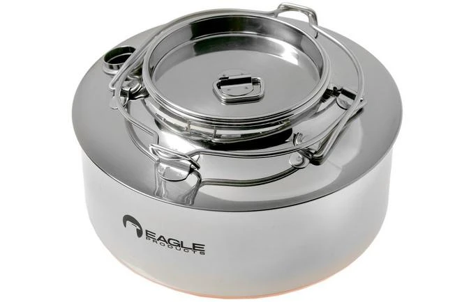 This Eagle kettle is a real classic. Use it to boil water on your stove or over an open flame. It is made from stainless steel and has a copper base. The base ensures that the heat is evenly distributed, making the water boil quickly. You can also cook in it, but the opening at the top is quite small, so cleaning it or turning over your food is not always easy.