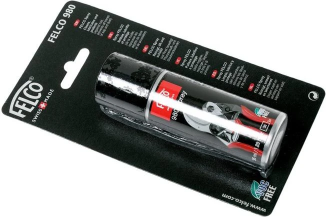 The formula of the Felco 980 maintenance spray is synthetic, quickly biodegradable, has a long shelf life, does not oxidize, is not sticky and won’t harden. This product was specifically developed to clean all metal parts on (garden) tools. This Felco spray protects against rust, penetrates the moisture and repels it. We recommend using this spray on all your garden tools before you store them. Contents: 56 ml.
