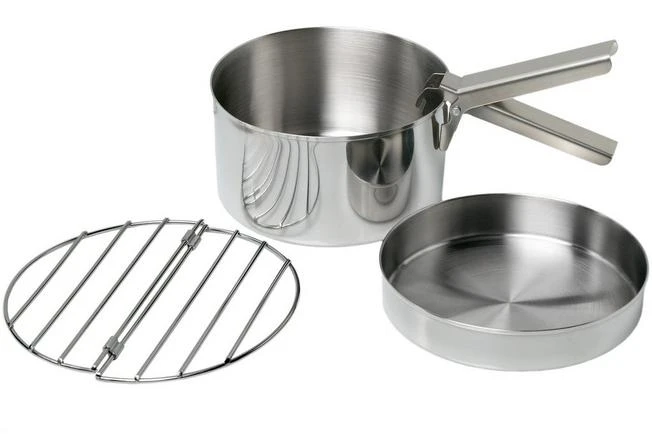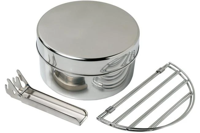 The Kelly kettle Cook set Large contains a 0.85 litre cooking pot with lid, grill and handle. The lid can also be used as a frying pan. With this accessory you can transform the Kelly Kettle Base Camp and Scout into a portable cooking hob or grill without having to add fuel. The Cook Set can be used in two ways.