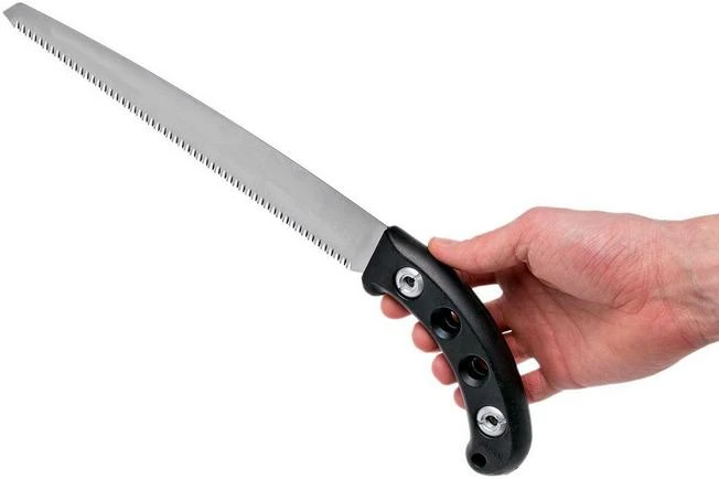 The Silky Gomtaro is a practical, fixed pruning saw. You use it to prune trees and shrubs. Because it has a fixed blade you don’t have to worry about it closing when you don’t want it to. In addition, when you have a fixed Silky blade you can perfectly align the shape and the ratio between the handle and the blade. Some believe that that is why the Gomtaro is even better to work with.