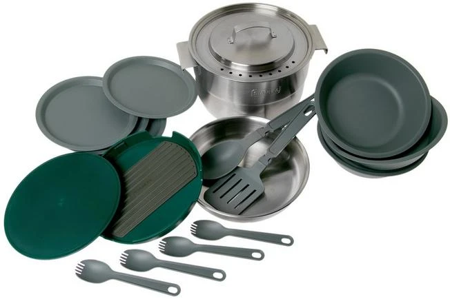 The Stanley Full Kitchen Base Camp pan set is your entire kitchen in one set! This 19-piece set is comprised of two pans, 8 plates, sporks and everything you need to prepare a delicious meal (except for the ingredients, of course). Everything fits inside the large pan. Great for car trips, weekends abroad or in your tiny house!