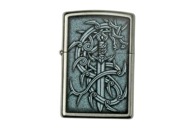 This Zippo lighter features a design with a cool dragon wrapped around a medieval sword. The rest of this Zippo is silver-coloured.